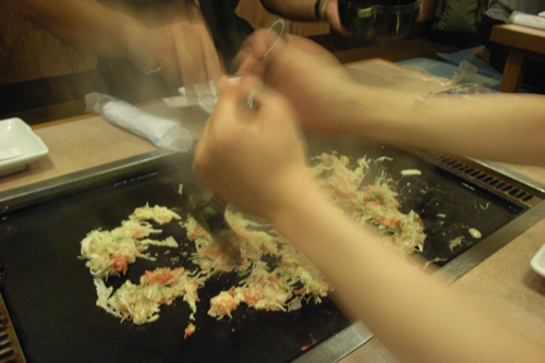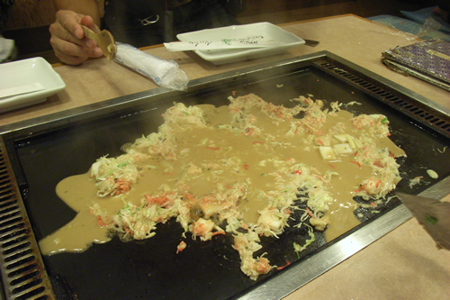 めさんが浅草もんじゃの焼き方を披露。土手を作らない浅草風です。
