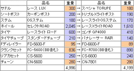 797gの軽量化。青は実測値、オレンジはカタログ値。