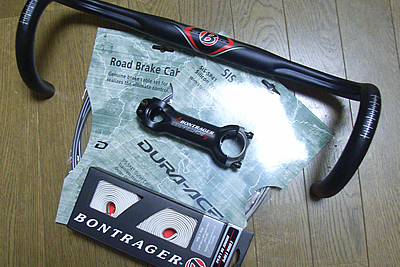 ボントレガーのレースライトOSステム(110mm/7度)とレースライトOS VR ROADハンドルバー(420mm)、バーテープ(ホワイト)、デュラのケーブル類を購入。