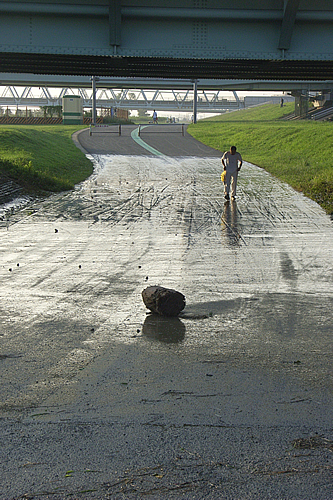土手の上を走るものの、何と岩淵先の未舗装路で落車。